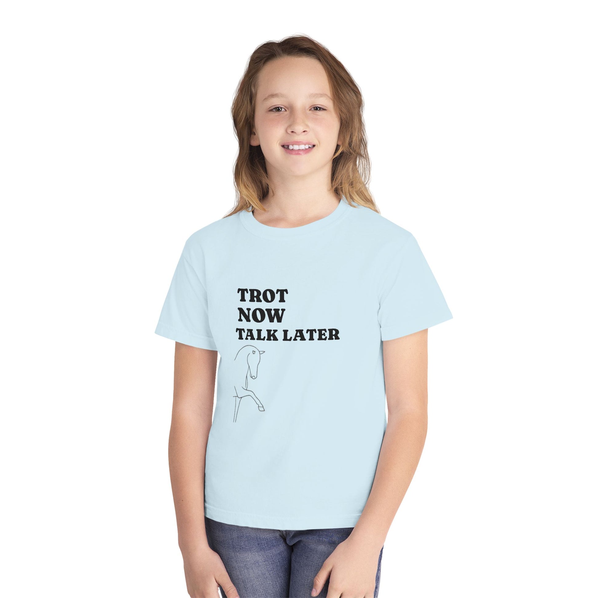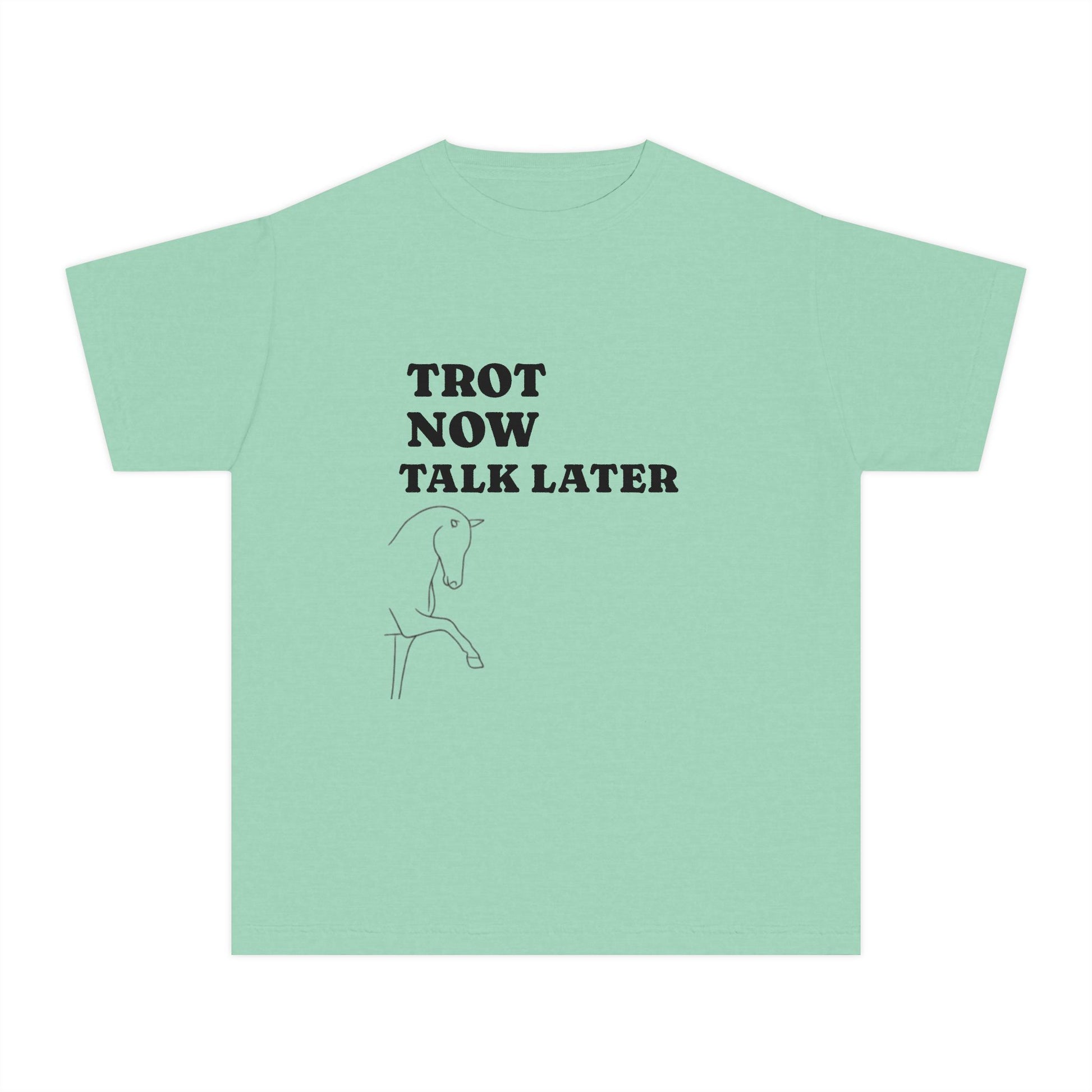 The 'Trot Now talk later' T-Shirt exudes a casual and fun vibe, perfect for horse lovers and equestrians. This tee is ideal for those who enjoy horse riding, and it makes a great gift for horseback riding enthusiasts on birthdays, Christmas, or any special occasion.